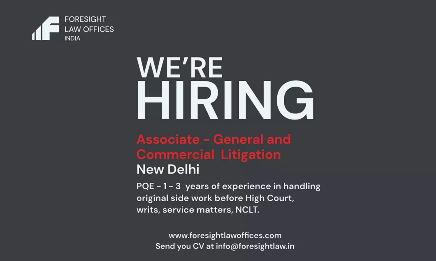 Foresight Law Offices India is inviting applications for the position of Associate to join its Litigation team to handle a diverse portfolio of commercial and civil disputes across forums.