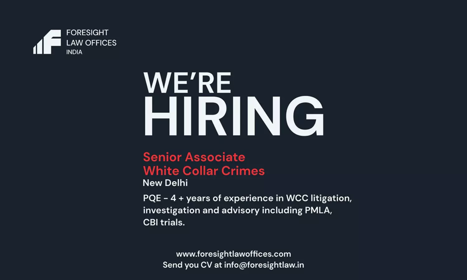 Interested candidates may email their CV along with a brief cover note to info@foresightlaw.in