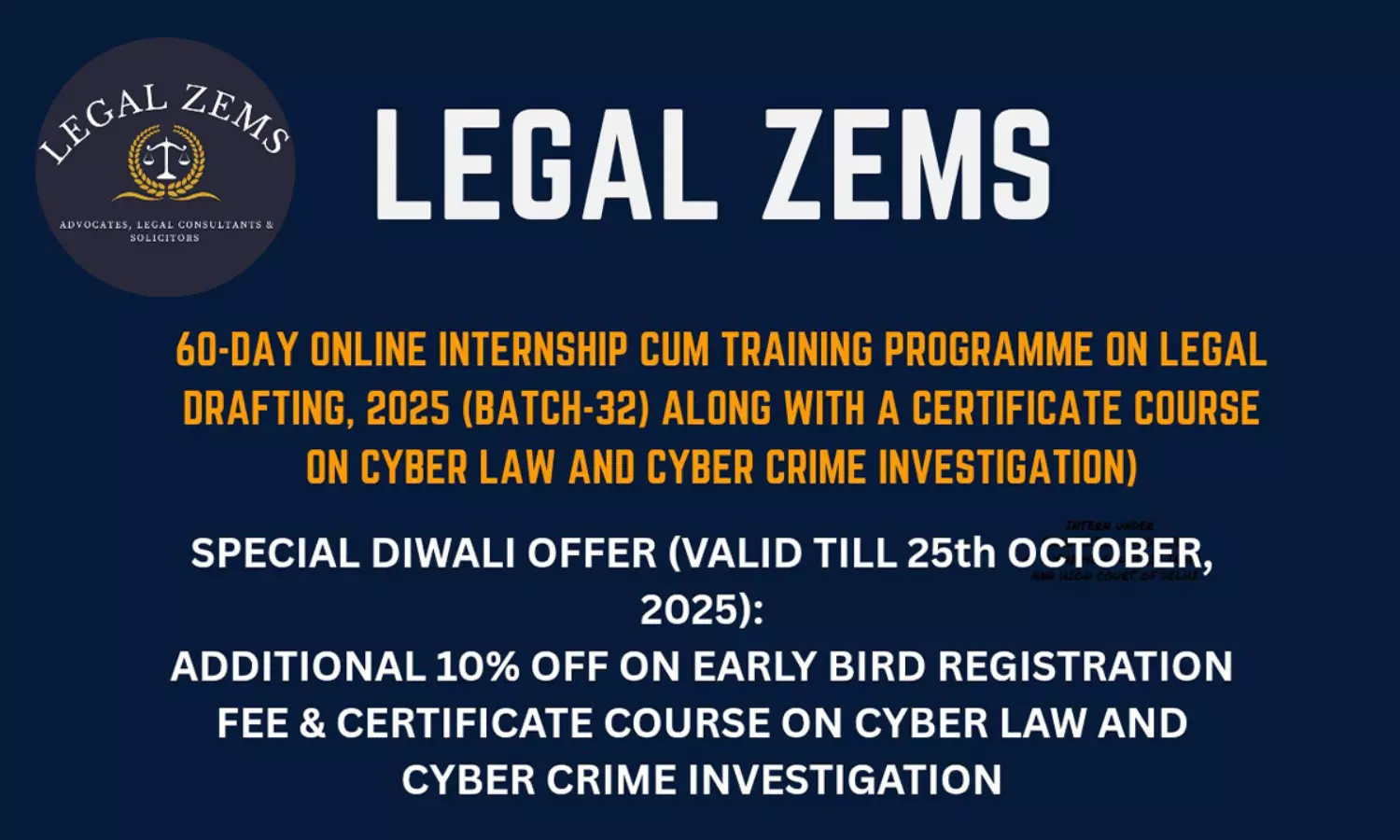 Legal Zems, a litigation-based law firms and legal organizations, has announced the launch of its 32nd Batch of Online Internship cum Training Programme on Legal Drafting, along with a Certificate Course on Cyber Law and Cyber Crime Investigation. The programme aims to provide law students and recent graduates with a hands-on understanding of drafting, litigation processes, and cyber law practice.