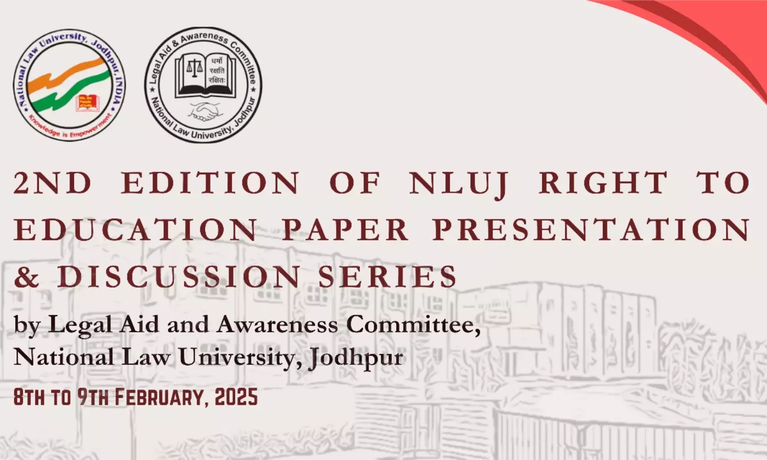 The 2nd NLUJ Right to Education Paper Presentation and Discussion, is being conducted by the Legal Aid and Awareness Committee (LAAC), at National Law University, Jodhpur. It aims to elevate awareness and exposure towards the practical aspects of the Right to Education Act (RTE Act), 2009. It seeks to understand the state of implementation of RTE in India through inputs of participants; highlight the gaps in the Right to Education Act, 2009; suggest and recommend the changes in the RTE Act, 2009 on the basis of statistics collected.