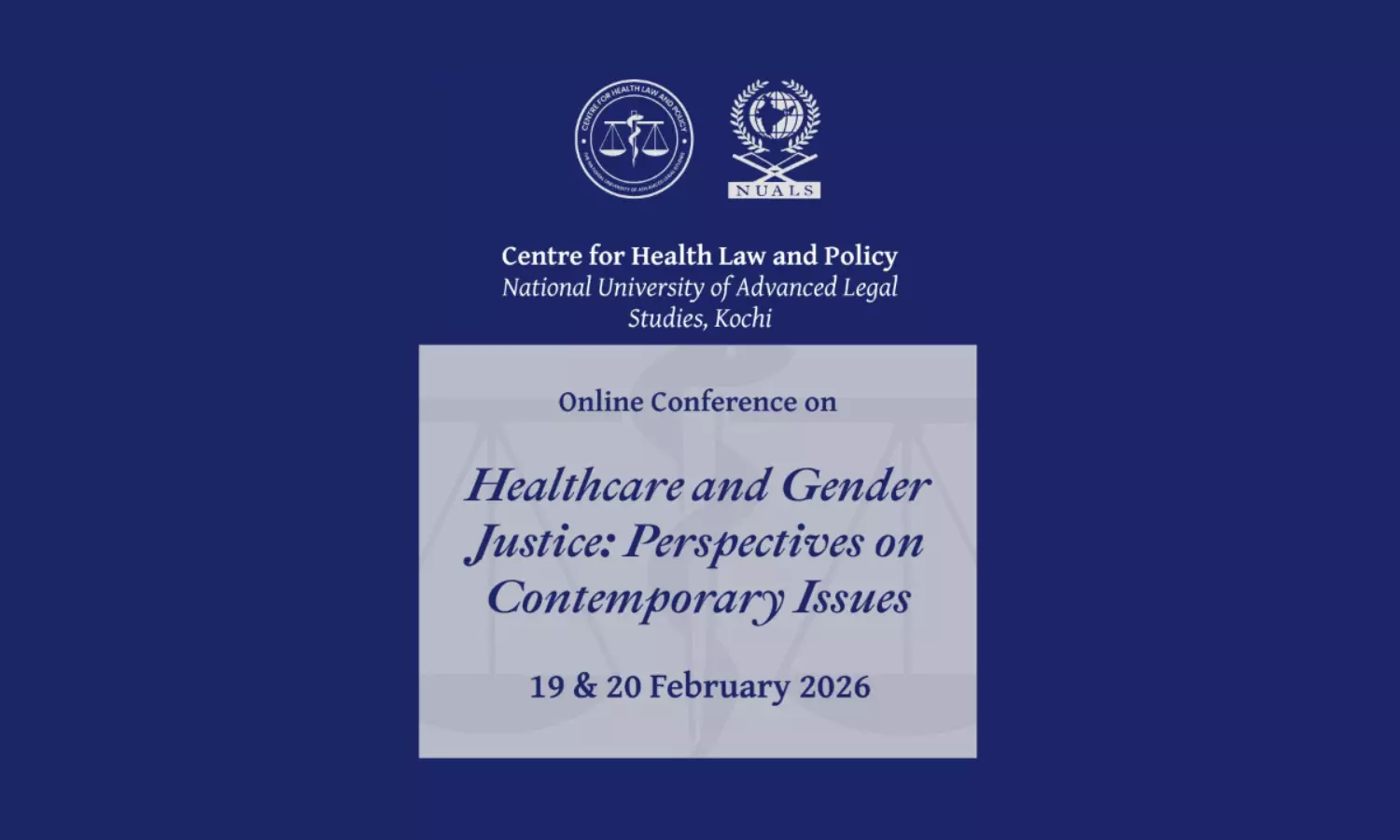 The Centre for Health Law and Policy (CHLP) at National University of Advanced Legal Studies (NUALS), Kochi, has announced the organization of an Online Conference titled “Healthcare and Gender Justice: Perspectives on Contemporary Issues”, scheduled for 19th and 20th February 2026.
