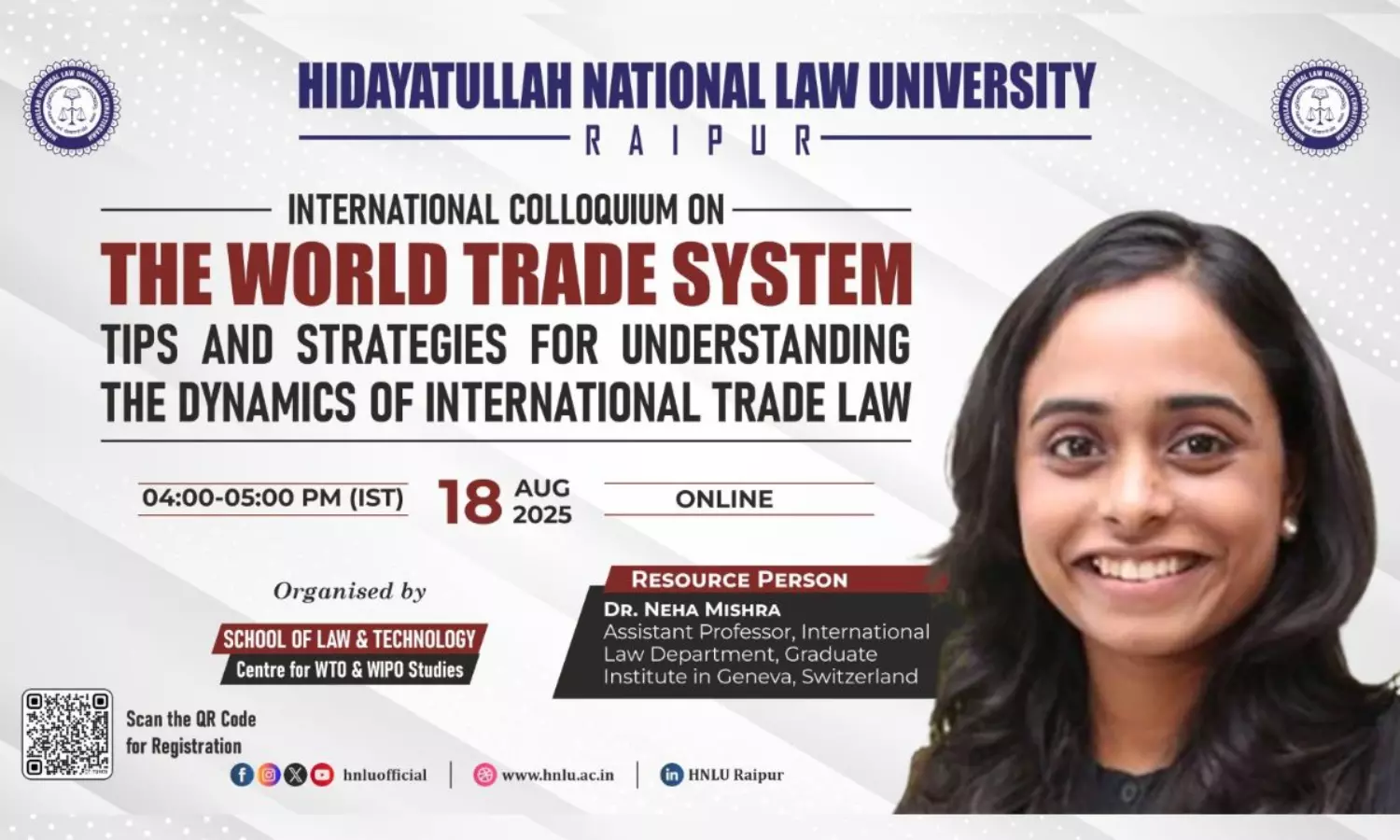 Hidayatullah National Law University (HNLU), Raipur, through its Centre for WTO & WIPO Studies, School of Law & Technology, hosted the International Colloquium on “The World Trade System: Tips and Strategies for Understanding the Dynamics of International Trade Law” on August 18, 2025.