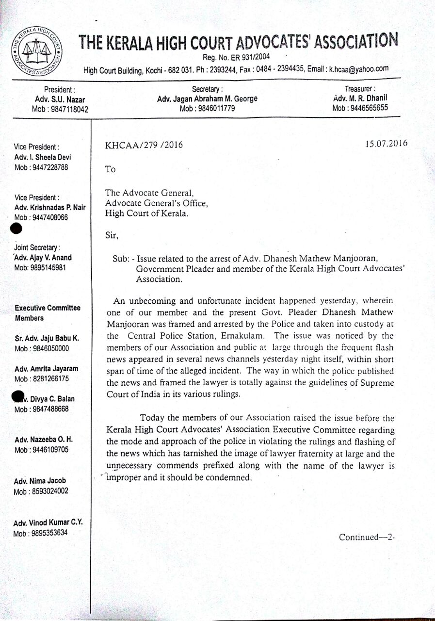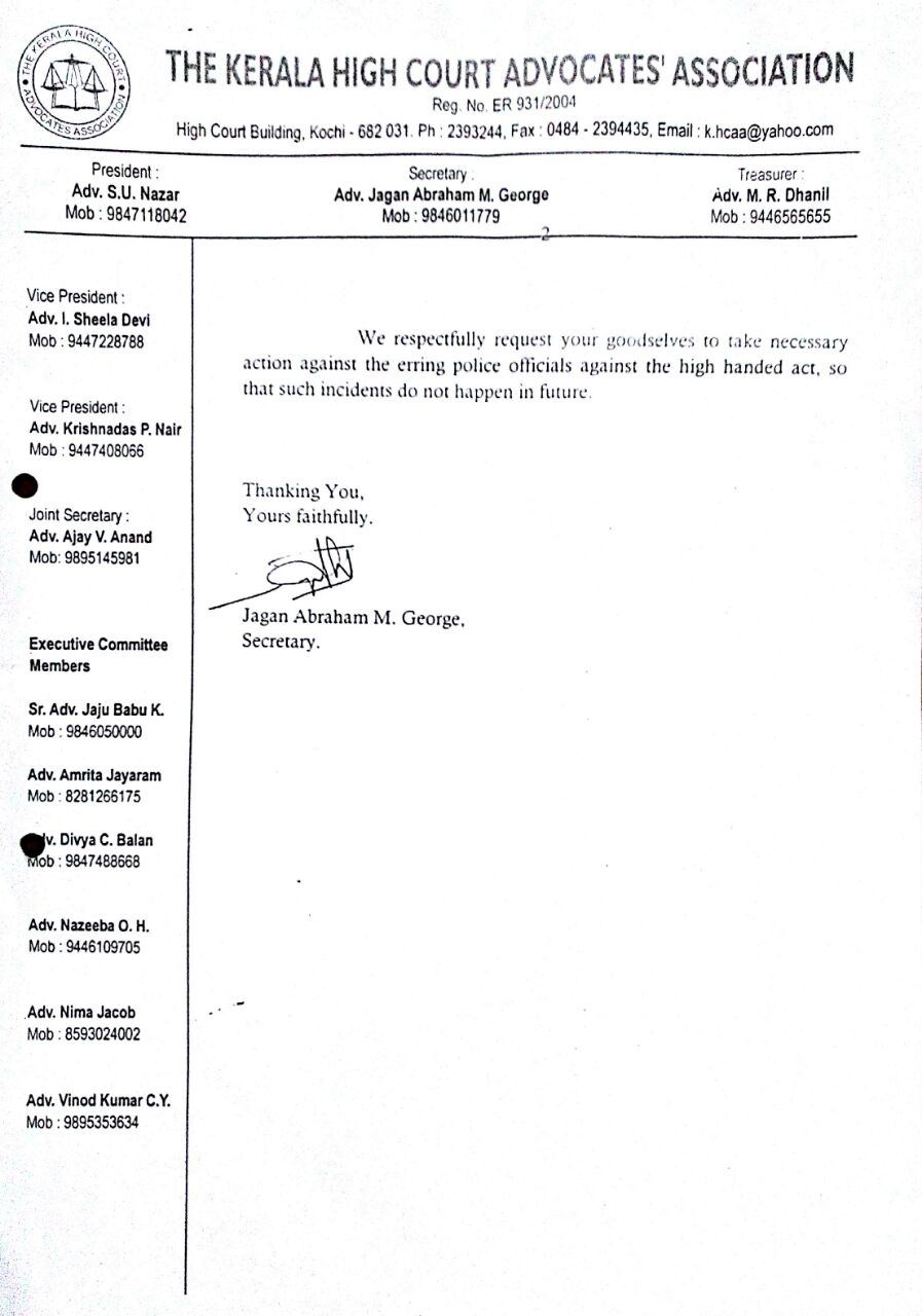 In the petition addressed to the Advocate General by Sri Jagan Abraham M George , Secretary, K.H.C.A.A, it was stated as follows:-“ Today the members of our Association raised the issue before the Kerala High Court Advocate’s Association Executive Committee regarding the mode and approach of the police in violating the rulings and flashing of the news which has tarnished the image of the lawyer fraternity at large and unnecessary commends prefixed along with the name of the lawyer is improper and it should be condemned.”