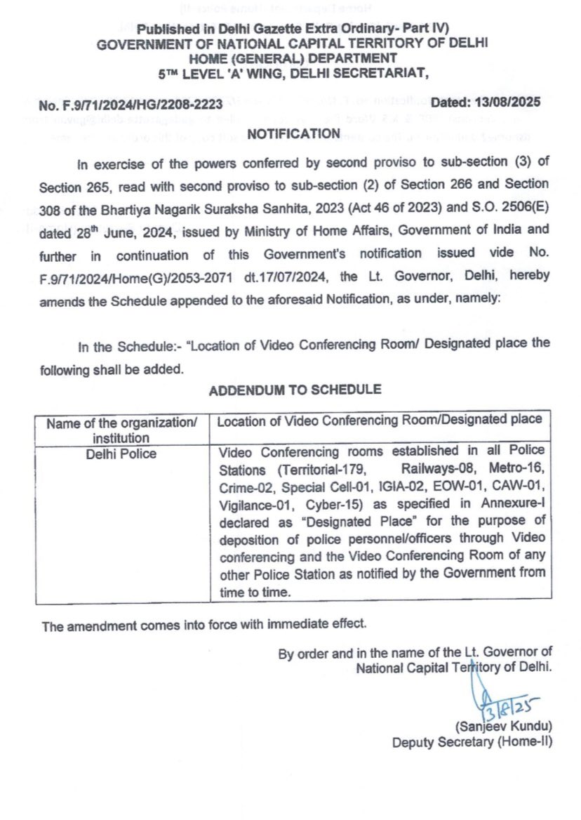 The notification, issued involving Section 265 of the BNSS, states that the 226 police stations in the national capital were “designated” as places from where the police officials can depose before the Courts through video-conferencing mechanism and present their evidence.