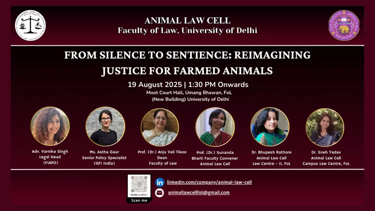 The Cell is organising a academic conference, "From Silence to Sentience: Reimagining Justice for Farmed Animals", on August 19, 2025, at 1:30 PM in the Moot Court Hall, Umang Bhawan, Faculty of Law (New Building). The event is open to students, practitioners, animal rights advocates, policy makers, and all interested in building a just, ethical, and sustainable society where every sentient life is protected.