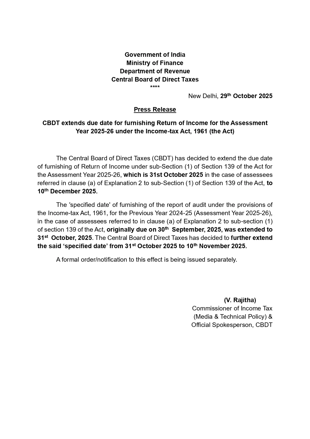 “The Central Board of Direct Taxes (CBDT), has decided to extend the due date of furnishing of Return of Income under sub-section (1) of Section 139 of the Income Tax Act for the Assessment Year 2025-26, which is 31st October 2025 in the case of assessees referred in clause (a) of Explanation 2 to sub-Section (1) of Section 139 of the Act, to 10th December, 2025.”
