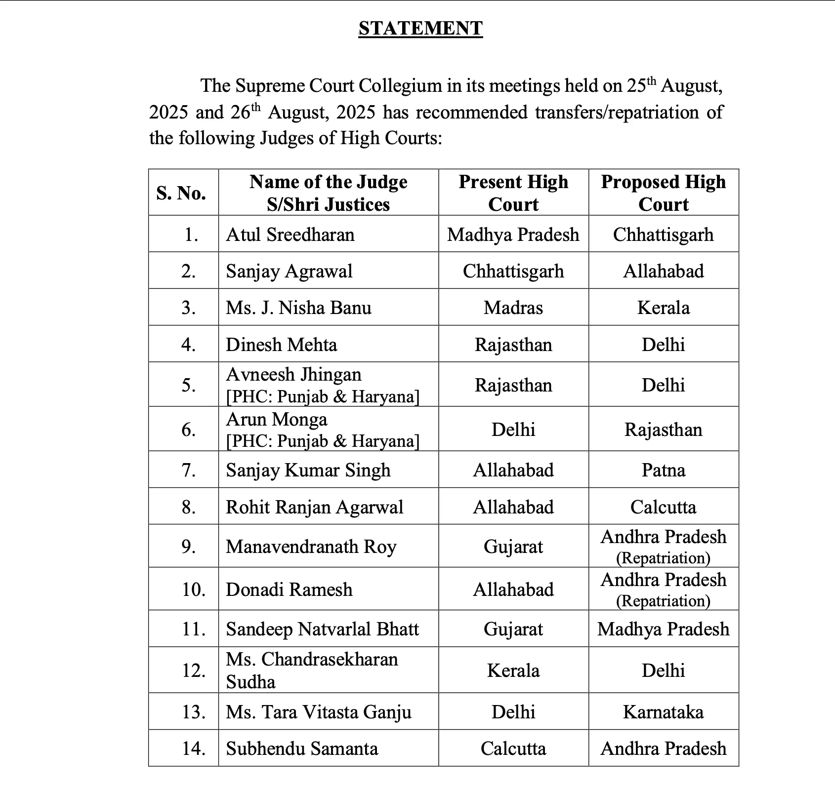 In a significant reshuffle of the higher judiciary, the Supreme Court Collegium has recommended the transfer of 14 judges across various High Courts. The move involves judges from Madhya Pradesh, Chhattisgarh, Madras, Rajasthan, Delhi, Allahabad, Gujarat, Kerala, Calcutta, Andhra Pradesh, and Patna High Courts.